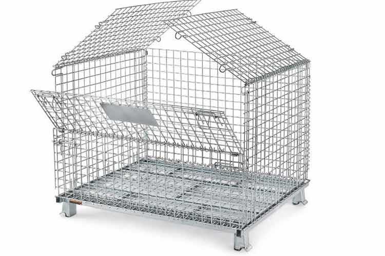 带盖蝴蝶笼具有牢固的插销结构构,既可以使蝴蝶笼在储物堆叠时关扣,又能够使各种不同状态下顺利开关,以储放物料。带盖蝴蝶笼的设计是为了随时存取货物提供了方便,在堆叠存储时,可以随时打开小门存入或取出物品,免除翻仓的麻烦;并且配合叉车、升降机、吊车等设备可进行作业。